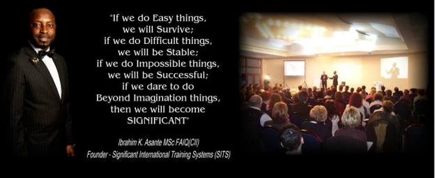Chairman, Significant International Group (SIG) and Founder of Significant International Training Systems (SITS), Ibrahim Kwame Asante has assisted thousands of individuals, professionals and organisations such as TIENS GROUP (a Multinational Chinese Health Company with presence in over 110 countries) where he also serves as UK Advisory Board Member, to achieve long-lasting beyond imagination performance results.