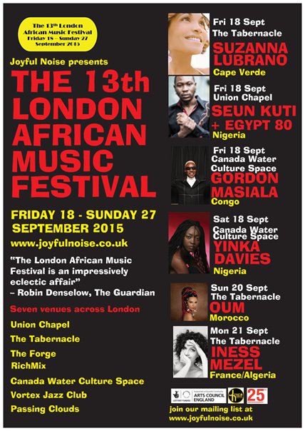 We have London debuts for three new divas in SUZANNA LUBRANO (Cape Verde), OUM (Morocco) and YINKA DAVIES (Nigeria). Suzanna Lubrano creates a musical world that is between zouk and R&B. Oum performances show a singer who knows her musical history and add something new to it. Yinka Davies’s position as a judge on Nigeria Idol gives her a weekly exposure to Nigerian homes. Her music is pure Afrobeat with soul styles thrown in.