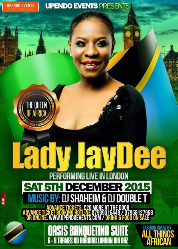 East African music lovers in London are in for a big musical treat on Saturday the 5th of December as Lady Jaydee will be performing live at The Oasis Banqueting Suite, 6-8 Thames Road, Barking, East London IG11 0HZ from 8.30pm