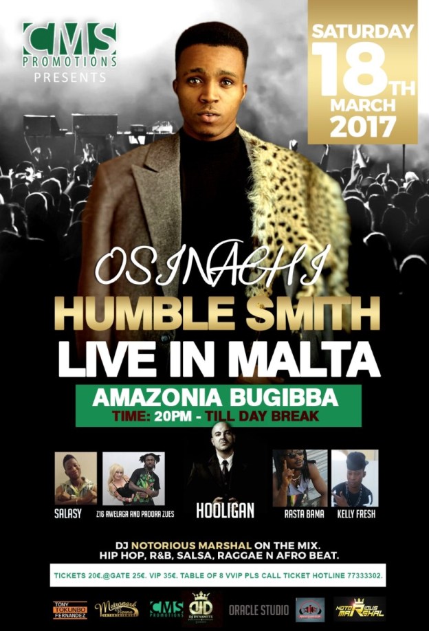 The amazing Afropop artist “Humble smith” will be performing live in Malta on Saturday the 18th of March 2017 . The much awaited live performance is inspired by CMS Promotions also based in Malta and managed by Mr Henry Ekezie, a passionate business entrepreneur who has made profound contribution to very many initiatives in Malta.