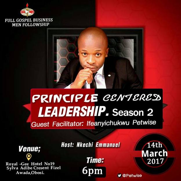 If you live around Onitsha be my guest and save these details. Date: 14th of march next week Tuesday. @ : Royal Gee hotel, No 19 Sylva Adibe Crescent fizel Awada, An amber State. Theme : PRINCIPLE CENTERED LEADERSHIP, Season 2… Time: 6pm dot.. Host: Nkechi Emmanuel, FGBMF president.