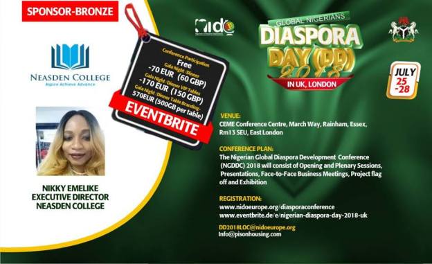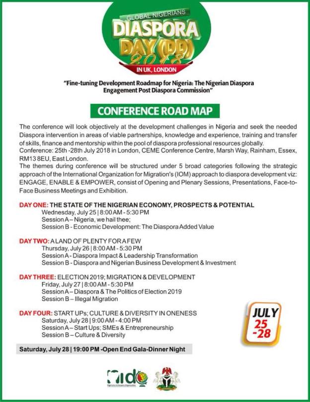 The Nigerian Diaspora Day Conference 2018 is now scheduled to hold from 25th -28th July in London UK. This Conference is coming almost 10 years after the aborted Nigerian Global Diaspora Development Forum that was planned for London, United Kingdom from 29th – 30th January 2010.