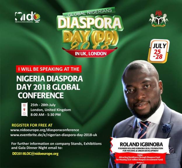 5. Diaspora Remittance and national development We call on all Diaspora Organisation to join in this historic edition of Nigerian Diaspora Day Conference 2018 in London, UK. Consultation with more sister Diaspora organizations are ongoing.