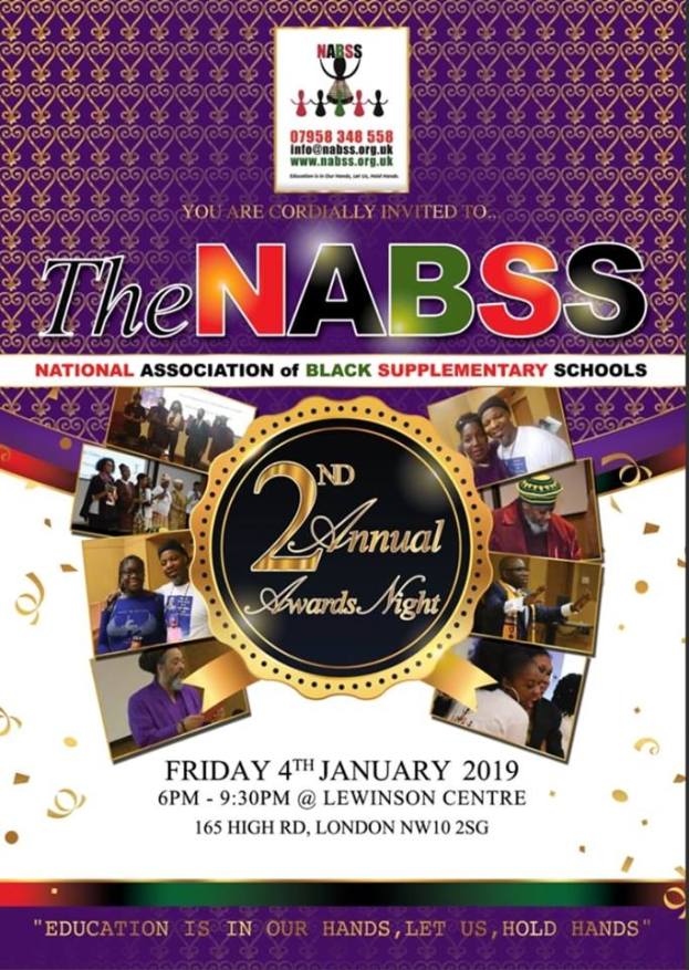 THE NATIONAL ASSOCIATION OF BLACK SUPPLEMENTARY SCHOOLS 2ND ANNUAL AWARDS TAKES PLACE ON FRIDAY THE 4TH OF JANUARY 2019 AT THE LEWINSON CENTRE , 165 HIGH ROAD, LONDON NW10 2SG FROM 6PM TO 9.30PM -DO NOT MISS IT