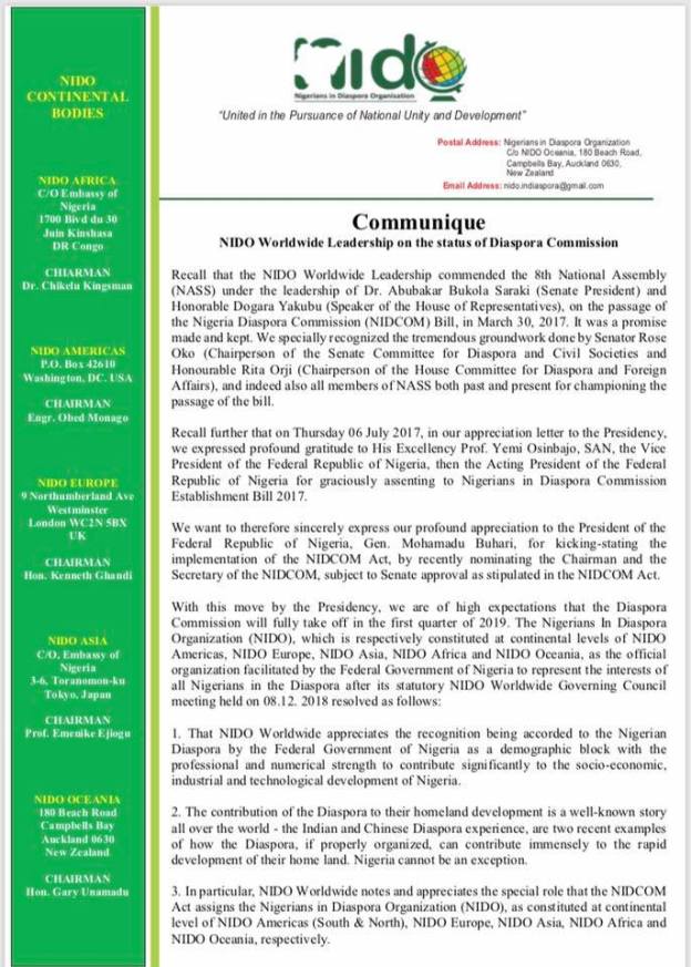 Recall that the NIDO Worldwide Leadership commended the 8th National Assembly (NASS) under the leadership of Dr. Abubakar Bukola Saraki (Senate President) and Honorable Dogara Yakubu (Speaker of the House of Representatives), on the passage of the Nigeria Diaspora Commission (NIDCOM) Bill, in March 30, 2017. It was a promise made and kept. We specially recognized the tremendous groundwork done by Senator Rose Oko (Chairperson of the Senate Committee for Diaspora and Civil Societies and Honourable Rita Orji (Chairperson of the House Committee for Diaspora and Foreign Affairs), and indeed also all members of NASS both past and present for championing the passage of the bill. Recall further that on Thursday 06 July 2017, in our appreciation letter to the Presidency, we expressed profound gratitude to His Excellency Prof. Yemi Osinbajo, SAN, the Vice President of the Federal Republic of Nigeria, then the Acting President of the Federal Republic of Nigeria for graciously assenting to Nigerians in Diaspora Commission Establishment Bill 2017. It was therefore my pleasure to handover a copy of NIDOWW communique on the status of Diaspora Commission to His Excellency Prof. Yemi Osinbajo, SAN, the Vice President of the Federal Republic of Nigeria on behalf of NIDOWW Leadership during his visit to Germany.