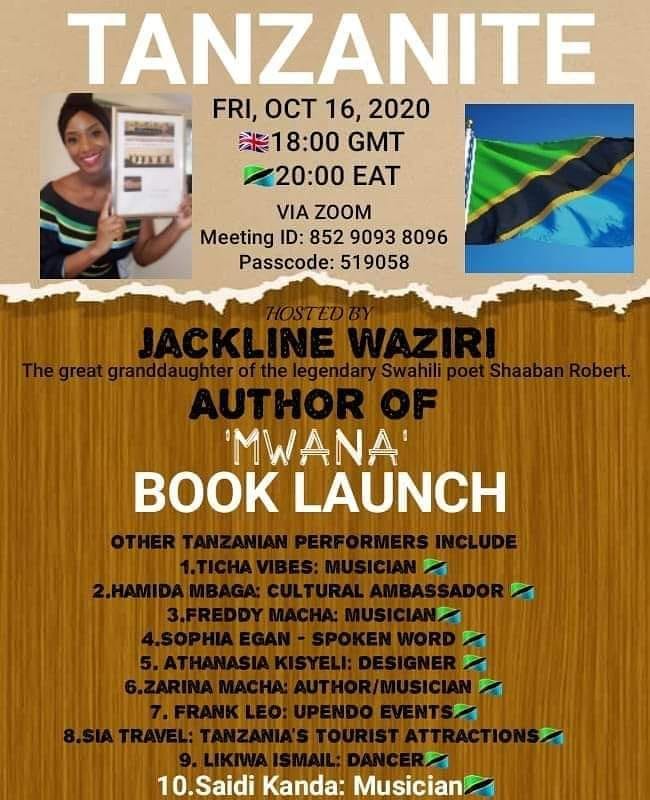 JACKLINE WAZIRI PRESENTS TANZANITE – BOOK LAUNCH MY FIRST BOOK IS COMING TO YOU LIVE & DIRECT ON THE 16TH OF OCTOBER 2020 18:00 GMTSAVE THE POSTER, DATE & TIME.