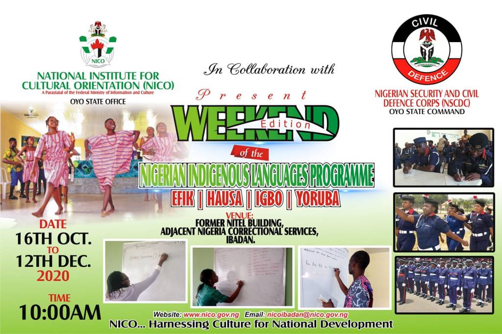 NICO Ibadan Office has concluded its plan to kick-start the Weekend Edition of the Nigerian Indigenous Languages Programme in collaboration with Nigeria Security and Civil Defence Corps (NSCDC) Oyo State Command on 16th October, 2020.