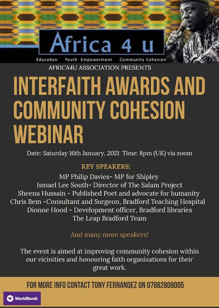 AFRICA4U ASSOCIATION will be organizing THE INTERFAITH VIRTUAL AWARDS AND COMMUNITY COHESION WEBINAR on Saturday the 16th of January 2021 at 8pm on the dot (UK Time) via Zoom.