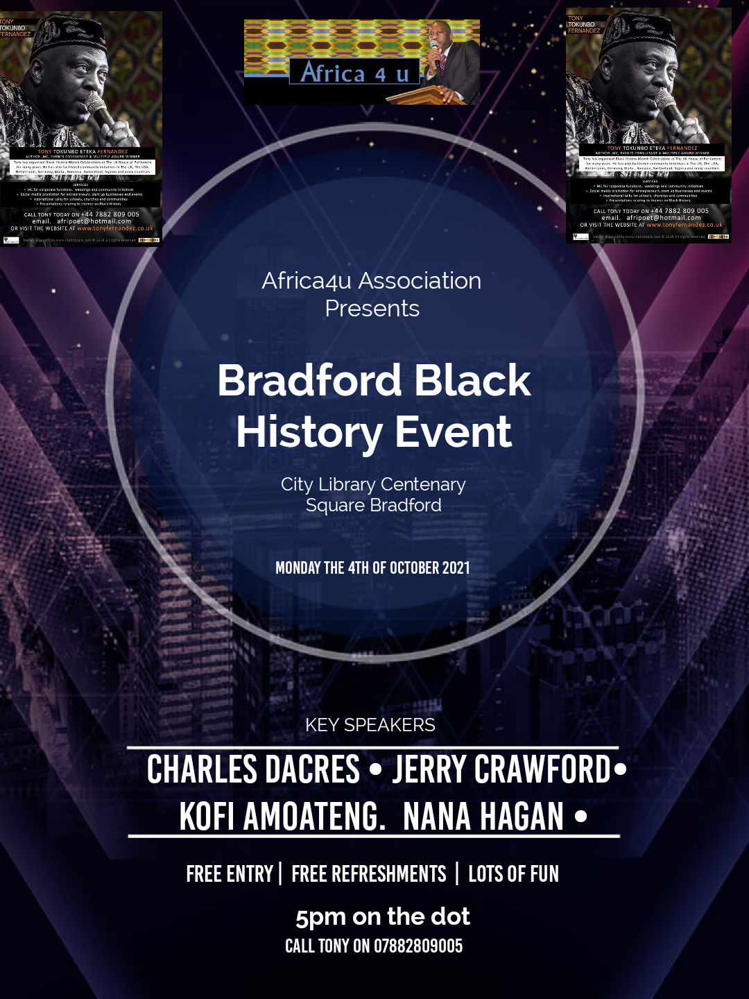 We are pleased to inform you that THE AFRIC4U ASSOCIATION will be organizing The Black History Month Celebrations at The City Library, Centenary Square Bradford BD1 1SD on Monday the 4th of October at 5pm on the Dot.