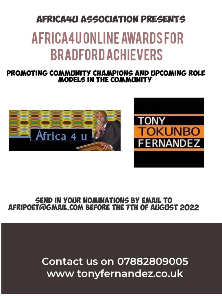 .Nominations are now open for The Africa4u Online Awards for Bradford Achievers, aimed at promoting Community champions and upcoming Role Within the community.