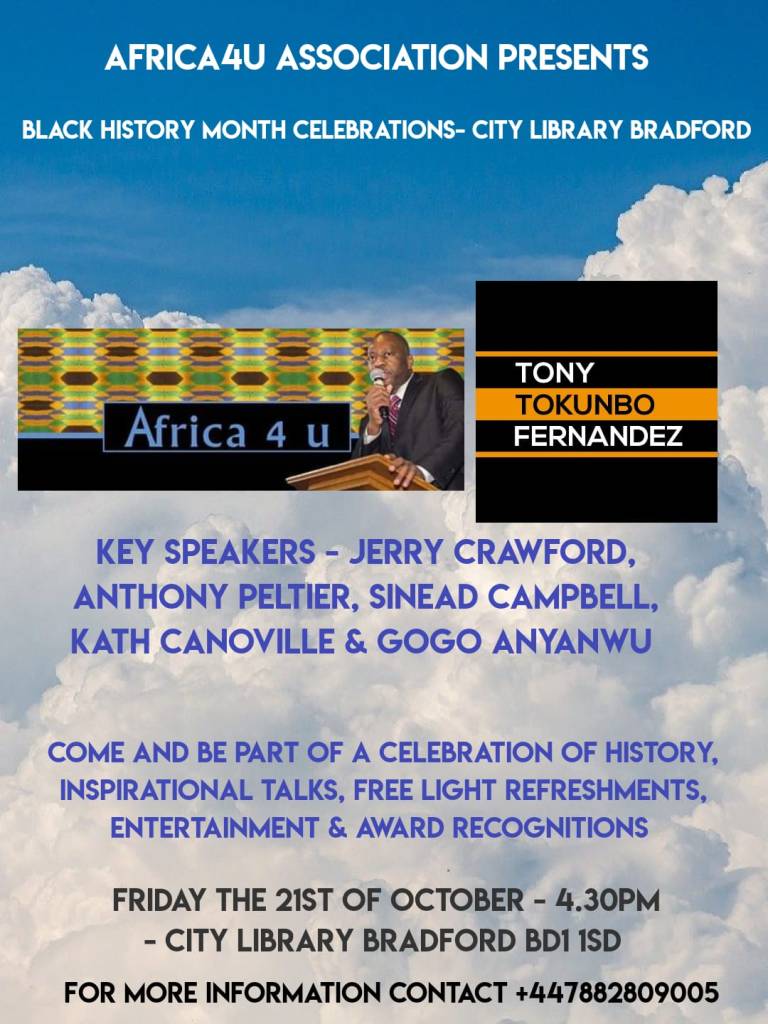AFRICA4U ASSOCIATION PRESENTS THE BLACK HISTORY MONTH CELEBRATIONS TAKING PLACE ON FRIDAY THE 21ST OF OCTOBER AT THE CITY LIBRARY CENTRAL BRADFORD AT 4.30PM ON THE DOT. Come and be part of a celebration of Black history, Inspirational talks, African Paintings , Entertainment, Networking , Free Light Refreshments and Awards Recognitions. Key speakers include Bradford based Jerry Crawford ( who will also be speaking at Our Black history month celebrations taking place at The UK House of Parliament, Bradford born Anthony Peltier ( who will also be speaking at Our Black history month celebrations at The UK House of Parliament). Sinead Campbell, Gogo Anyanwu and Kath CANOVILLE. There will also be special performances by OPhills and Poetry by Tricia Arthur Stubbs , This is a free event you cannot afford to miss, For more information contact+447882809005