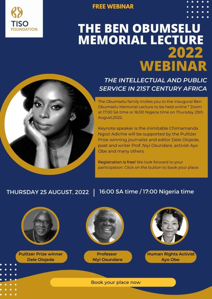 Please join us at the Inaugural Ben Obumselu Memorial Lecture holding online on ZOOM at 4pm Nigeria time, on Thursday, August 25, 2022.