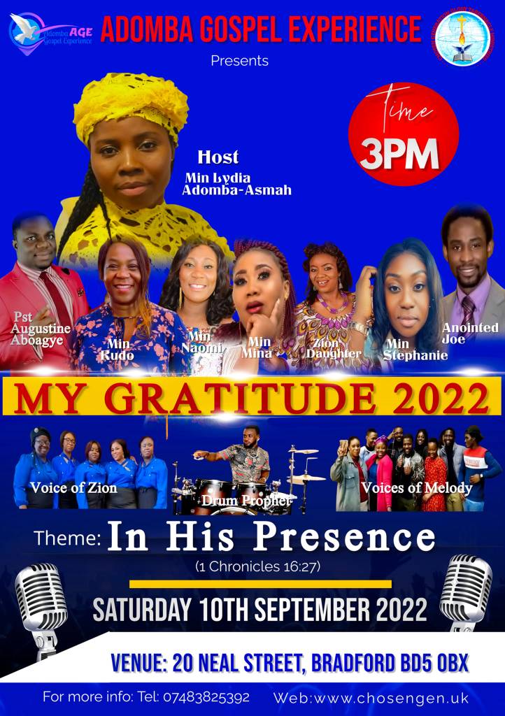 ADOMBA GOSPEL EXPERIENCE PRESENTS “MY GRATITUDE 2022” TAKING PLACE ON SATURDAY THE 10TH OF SEPTEMBER FROM 3PM ON THE DOT AT 20 NEAL STREET, BRADFORD, BD5 0BX