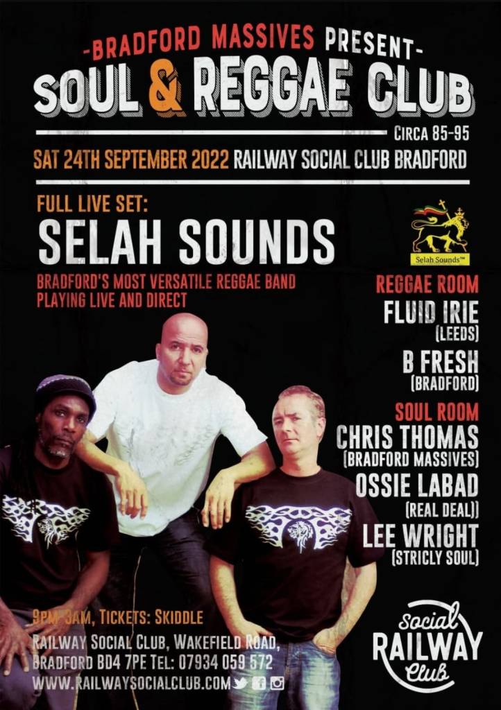 COME AND BE PART OF AN AMAZING EVENING OF SOUL AND REGGAE, TAKING PLACE ON SATURDAY THE 24TH OF SEPTEMBER 2022 FROM 9PM TO 3AM AT THE RAILWAY SOCIAL CLUB, WAKEFIELD ROLAD, BRADFORD, BD4 7PE