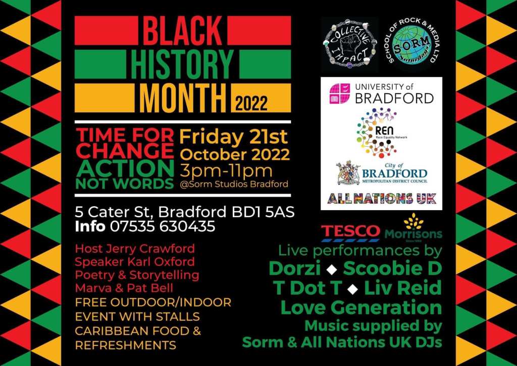 ALL ROADS LEAD TO SORM STUDIOS, 5 CATER STREET, BRADFORD FOR AN AMAZING ALL DAY BLACK HISTORY MONTH INITIATIVE WITH LIVE PERFORMANCES BY DORZI, SCOOBIE D, T DOT T, LIVE REID, LOVE GENERATION