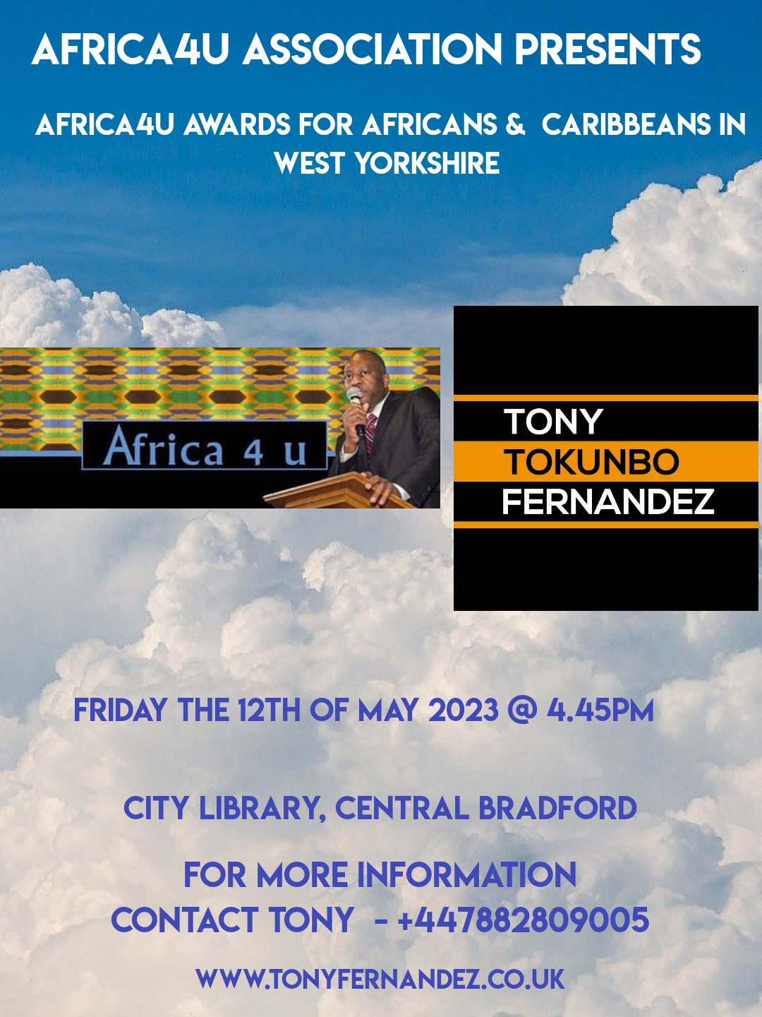 THE AFRICA4U AWARDS FOR AFRICANS AND CARIBBEANS LIVING IN WEST YORKSHIRE IS ORGNISED EVERY SINGLE YEAR TO CELEBRATE AND PROMOTE THE TRUE LIFE AND SUCCESS STORIES OF AFRICAN AND CARIBBEANS ACHIEVERS LIVING IN WEST YORSHIRE.