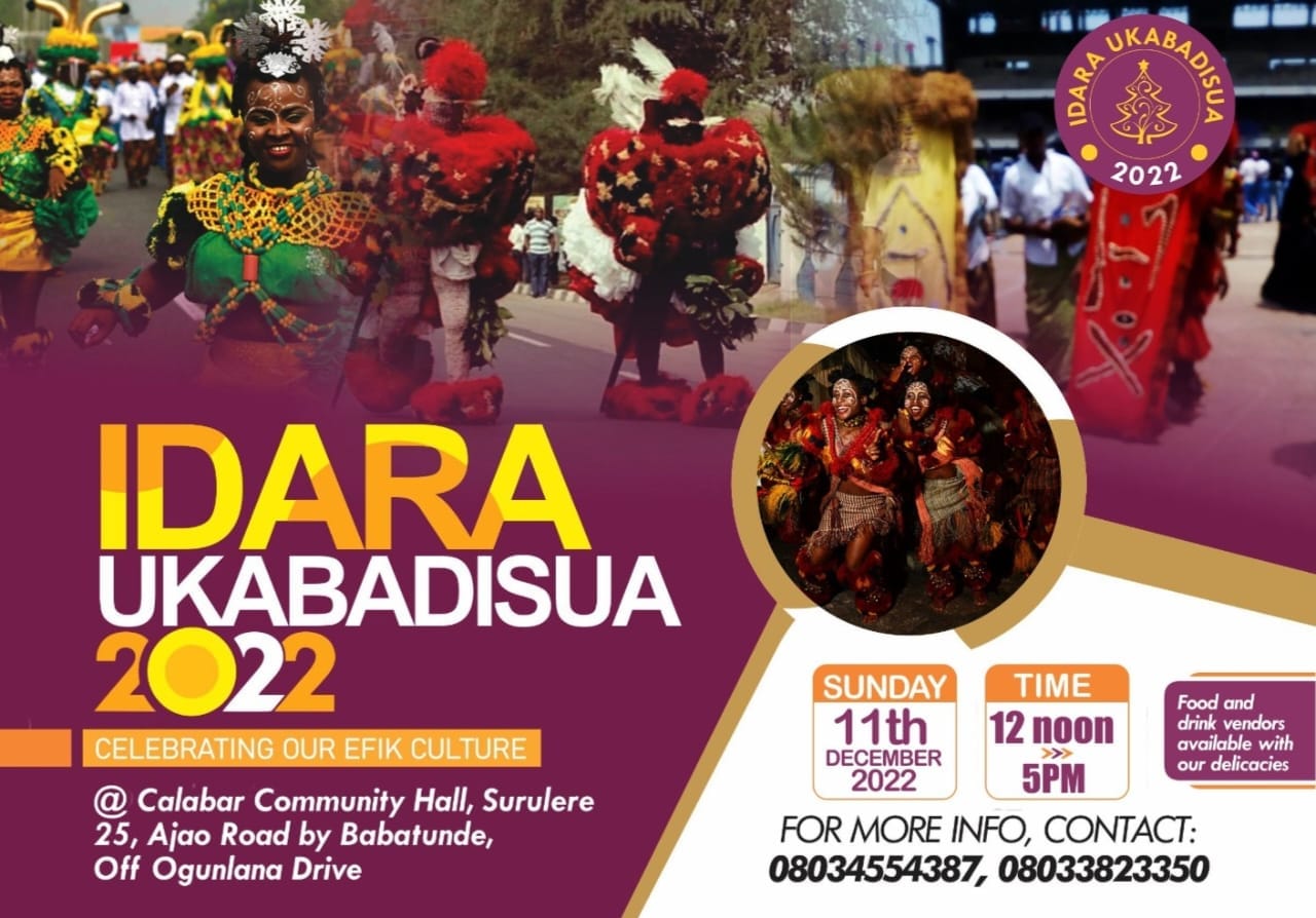 IDARA UKABADISUA, CELEBRATING EFIK CULTURE TAKES PLACE AT CALABAR COMMUNITY HALL, SURULERE, LAGOS on Sunday the 11th of December 2022 from 12 NOON .