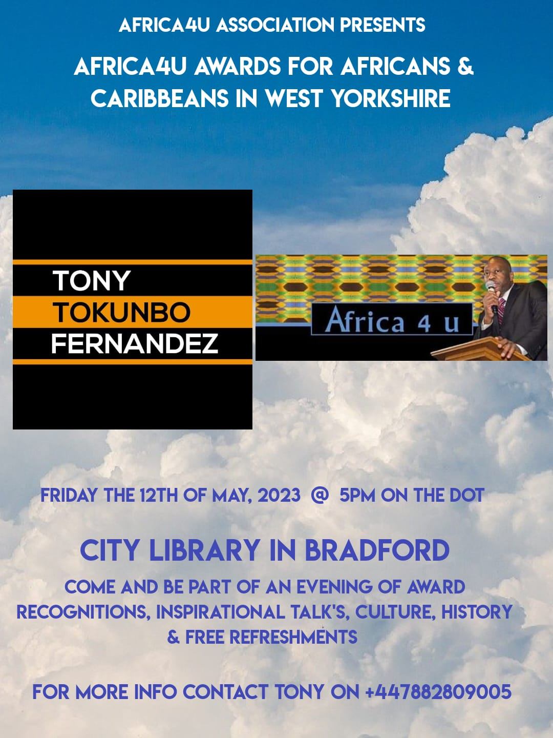 We are pleased to inform you that FREE TICKETS are now available for Our AFRICA4U AWARDS FOR AFRICANS AND CARIBBEANS LIVING IN WEST YORKSHIRE taking place on FRIDAY THE 12TH OF MAY 2023 (5PM) at The City Library in Bradford West Yorkshire.