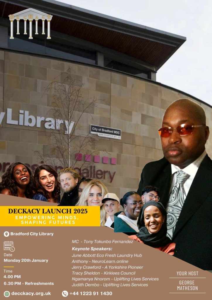 DECKACY Launch 2025: Shaping the Future of Innovation and Inclusivity Bradford, UK* – The City Library in Bradford will host the eagerly awaited DECKACY Launch event on *Monday, 20th January 2025, at 4:00 PM*. DECKACY is a revolutionary initiative committed to championing *innovation, empowerment, and community*, with a vision to create a more inclusive society for all.